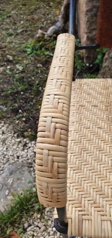 Réparation d’un fauteuil en lame de rotin sur structure métallique – assise et accoudoirs